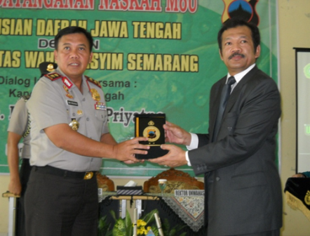 Sampangan -  Penandatanganan MoU oleh Kapolda Jateng, Inspektur Jenderal (Irjen) Polisi Drs. Dwi Priyatno dan Rektor Universitas Wahid Hasyim (Unwahas), Dr. H. Noor Achmad, menandai dimulainya kerjasama antar kedua belah pihak. Acara yang  berlangsung di kampus setempat tersebut dihadiri oleh pejabat teras, baik yang ada dijajaran Polda Jateng maupun Unwahas (23/10).