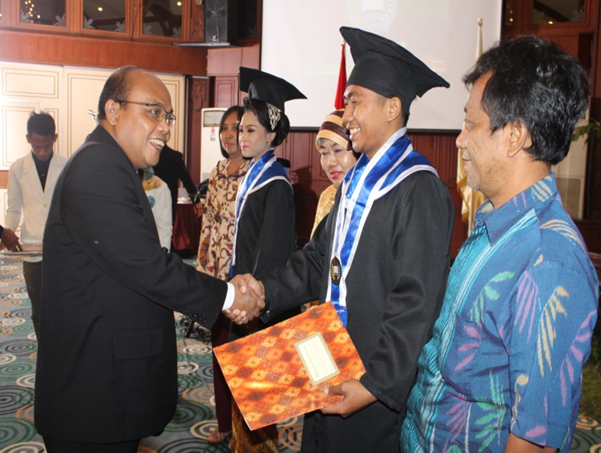 Tampak pada gambar, Prof. DYP sedang menyerahkan secara simbolis sertifikat Koperasi yang dikeluarkan institusi setempat kepada perwakilan wisudawan.