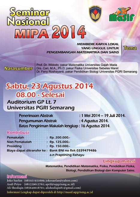 Universitas PGRI Semarang akan mengadakan Seminar Nasional dengan tema "Membidik Karya Lokal Yang Unggul Untuk Pengembagan Matematika, Sains dan Pendidikan". Yang akan diselenggarakan pada hari Sabtu, 23 Agustus 2014 bertempat di Auditorium GP Lt. 7, Universitas PGRI Semarang.