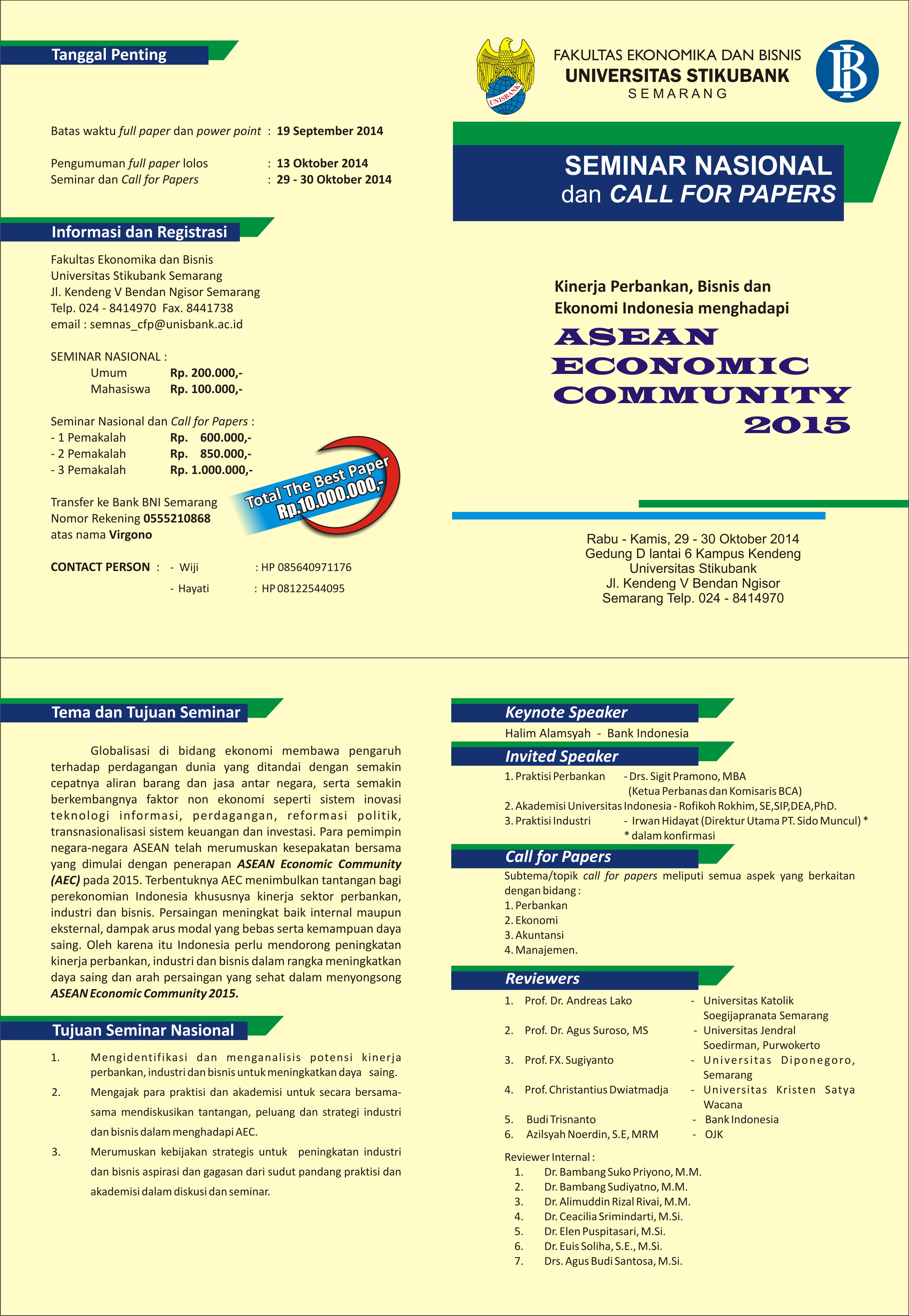 Dengan hormat, kami informasikan bahwa Fakultas Ekonomika dan Bisnis (FEB) Universitas Stikubank Semarang menyelenggarakan Seminar Nasional dan Call of Papers dengan tema “KINERJA PERBANKAN, BISNIS DAN EKONOMI MENGHADAPI ASEAN ECONOMIC COMMUNITY 2015” yang akan diselenggarakan pada :